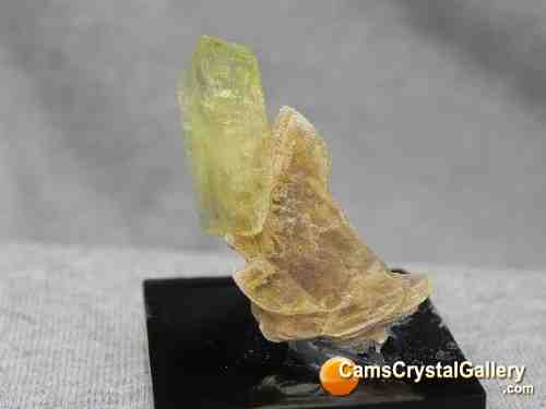 This specimen comes from the type local. Hence its name. The brazilianite crystal is about 2 cm long and has a gemmy termination. It appears double terminated where it is attached to the star mica. Stand included.