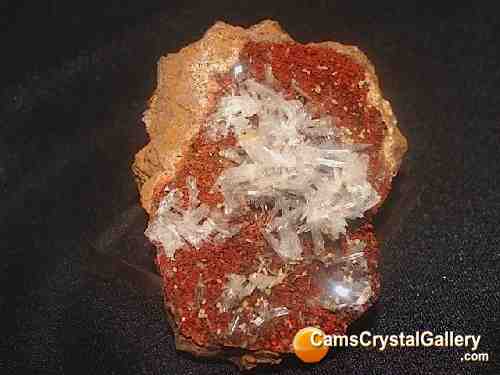 This is an another uncommon combination of hemimorphite in a red bed of carminite. It is mostly undamaged and a true collector piece. With great contrast in the clear hemimorphite and red carminite. A choice piece.